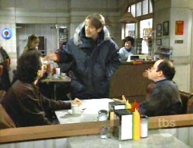 Hanke: "Hey, George. Jerry. Listen, I just got sober, so I've been going through the Twelve Steps." George: "What are you up to now, uh, Step Nine?" Hanke: "Yeah. Making amends."